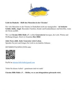 Der Winter ist kalt. Doch für viele Menschen in der Ukraine ist er unerträglich. In den letzten Tagen und Wochen wurden gezielt Kraftwerke und Versorgungsnetze angegriffen. Strom fällt aus, Heizungen bleiben kalt, Licht geht verloren. Zurück bleiben Dunkelheit, Angst und eisige Kälte.